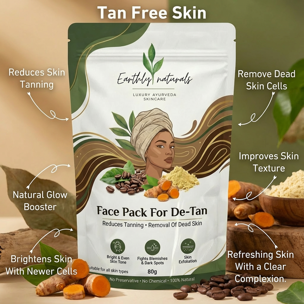 Earthly Naturals De-Tan Face Pack Naturally de-tans, deep-cleans, and refreshes skin for a clear, oil-free, healthy glow.Enriched with mineral-rich Multani Mitti and herbal actives, it leaves your skin clean, clear, and naturally radiant—perfect for regular use on all skin types. perfect for tanning removal.